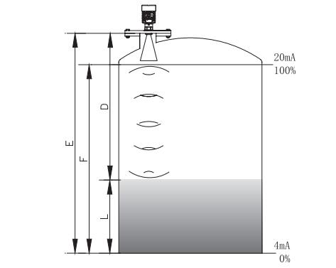 通過輸入空罐高度E(=零點),滿罐高度F(=滿量程)及一些應用參數來設定,應用參數將自動使儀表適應測量環境。對應于4~20mA輸出。