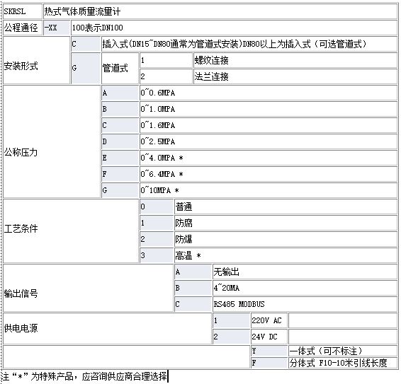 SKRSL系列熱式氣體質量流量計 熱式氣體質量流量計是利用熱傳導原理測量流體流量的儀表,該儀表采用恒溫差法對氣體質量流量進行準確測量。熱式氣體質量流量計具有體積小,數(shù)字化程度高,安裝方便,測量準確等優(yōu)點。 一、SKRSL系列熱式氣體質量流量計產品優(yōu)勢: 1、特有流量數(shù)據(jù)模型算法;模糊理論控制溫度、濕度算法; 2、智能微處理器及模數(shù)、數(shù)模轉換芯片; 3、寬量程比1000:1;大口徑,低流速,壓損可忽略; 4、直接測量質量流量,無須溫壓補償; 5、低流速測量非常靈敏; 6、設計、選型方便,安裝、使用簡便; 7、適合各類單一或混合氣體流量測量。 二、SKRSL系列熱式氣體質量流量計產品特點: 1、采用鉑RTD傳感器技術 2、采用享有“平衡結構封裝”技術,介質溫度自補償 3、特有算法,可實現(xiàn)線性、重復性、精度好 4、量程比寬1000:1,可據(jù)用戶要求可拓展 5、可實現(xiàn)大管徑小流量測量,最小流量可測低至零,分辨率0.001m/s 6、無可動部件、振動影響可忽略 7、直管段要求不高1-2D 8、與介質的溫度、壓力無關 9、特有高溫算法,介質溫度可達+400℃, 10、采用高濕算法,實現(xiàn)精度準確測量 11、對流量信號鍵入12點動態(tài)修正,內置10點修正 12、在線動態(tài)校正電流/電壓輸出 13、對粉塵等小顆粒不敏感 14、在線不斷流裝卸,維護方便 三、熱式氣體質量流量計應用場合: 1、公用工程---電﹑氣﹑ 水處理的監(jiān)控 管道的氣體;通用系統(tǒng);沼氣;煤氣;天然氣;液化氣;鍋爐預熱空氣 2、石油與天然氣工業(yè) 能量交換;填井氣回收;燃氣計量;氣體質量分析;泄漏氣測試;天然氣測量;火炬氣的監(jiān)控 3、電力行業(yè) 燃料系統(tǒng)中氣體分配過程中的氣體測量;鍋爐及輔助系統(tǒng)中各種氣體的測量;燃氣爐中氣體測量;氫氣測量;電廠高爐的一次風、二次風的測量 4、化學行業(yè) 煙氣循環(huán)監(jiān)測;采樣系統(tǒng)中氣體流量計量;引風機的氣體流量計量;化肥廠氨氣測量 ;電池工廠各種氣體流量測量 5、冶金行業(yè) 鋼鐵廠加氣測量;煉鐵廠高爐煤氣的測量;焦化廠焦爐煤氣的測量;軋鋼廠加熱爐燃氣(高爐煤氣、焦化煤氣、天然氣等)的測量控制;熱處理淬火爐等的氫、氧、氮等氣體的控制 6、紙漿與造紙行業(yè) 廢水處理系統(tǒng)中氣體的測量;煙道流量監(jiān)控;鍋爐回收二次/三次空氣;鍋爐的燃氣和空氣送風測量 7、食品及醫(yī)藥行業(yè) 加工操作中新鮮空氣的加入;啤酒廠中的二氧化碳處理;瓶子消毒器中的熱空氣的流量;熱氧化過程中氣體流量測量;通風系統(tǒng);鍋爐進氣﹑廢氣﹑過程控制 8、環(huán)保 沼氣利用過程中的氣體測量;氯氣處理過程中氯氣氣體測量;污水處理過程中曝氣池的氣體測量;煙筒煙道排氣監(jiān)測SO2和NOX的排量 9、其他行業(yè) 工廠壓縮空氣測量;煤粉燃燒過程粉/氣配比控制燃料;水泥工業(yè)豎式磨粉機排放熱氣流量控制 四、熱式氣體質量流量計性能指標: 1、測量范圍:0.5—100Nm/s (20℃,101.33KPa) 2、精度: ±1.5%的讀數(shù) ±1.5%滿量程 3、量程比:通常100:1(取決于標定流量的范圍) 4、管徑范圍:DN20~5000mm 5、應用范圍:適合各類單一或混合氣體。含塵、含沙、含濕氣、各種腐蝕性氣體。(乙炔氣體除外) 6、環(huán)境溫度范圍: -40℃~+85℃(無顯示); -30℃~+70℃(有顯示); 濕度小于90%RH 7、介質溫度范圍: -40℃~+100℃;-40℃~+200℃; 8、傳感器直徑:ф3、ф2.5 9、插入式傳感器探桿直徑:ф19(標準)、ф16、ф12 10、傳感器材質:316不銹鋼、哈氏合金、鈦 11、探桿材質(保護套):316不銹鋼(標準)、哈氏合金 12、雙向測量介質流量 13、模擬量輸出:流量:4-20mADC,溫度:4-20mADC,最大負載:1000Ω 14、累積脈沖量輸出 15、鍵入12段非線性修正,內置10段非線性修正 16、通訊:串口輸出RS232/RS485 17、供電電源:24VDC/600mA;220VAC/2W;110VAC/3W 18、報警:1-2路繼電器輸出、5A/220V、5A/30VDC、鍵入設定 19、大屏幕LCD顯示:七位瞬時流量,八位累積流量 20、過程壓力:1.6Mpa(最大20MPa) 21、安裝工藝形式:插入式(卡套、卡套+球閥、法蘭連接)適用于DN80以上的管道安裝,管道式(法蘭、螺紋連接)適用于DN15以上的管道安裝。 22、防爆等級:本安型(iaⅡCT5)、隔爆型(ExdⅡCT4) 23、防護等級:IP65 五、傳感器參數(shù): 管段傳感器數(shù)據(jù)表 (螺紋連接) ![]() 注:DN<20mm時,傳感器尺寸請咨詢我公司 管段傳感器尺寸表(法蘭連接) ![]() 六、口徑與流量對應表 ![]() 七、產品選型: