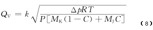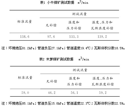 0 引言 針對瓦斯抽放管道中流量計量裝置不同的安裝環(huán)境,目前煤礦使用的流量計主要有差壓式V錐流量計和威力巴流量計、熱線式流量計。差壓式V錐流量計和威力巴流量計需要配置信號處理儀表,但市場上配置的信號處理儀表只能采集1個差壓信號用于計算瓦斯抽放管道流量,且沒有考慮環(huán)境條件變化對流量的影響,不能進行實時補償,造成流量測量結(jié)果誤差較大。鑒此,一種具有動態(tài)補償?shù)?strong>差壓式瓦斯抽放流量儀表,可同時測試管道差壓、管道負壓、環(huán)境絕壓、管道溫度、管道瓦斯?jié)舛?個環(huán)境參數(shù),并對管道瓦斯流量測量進行實時補償,提高了流量測量的準確性。 1 測量原理及補償方法 1.1 傳感器測量原理 差壓式V錐流量計和威力巴流量計是由傳感器和信號處理儀表組成的測量裝置。傳感器產(chǎn)生一個依據(jù)流量大小而變化的差壓。具有動態(tài)補償?shù)牟顗菏酵咚钩榉帕髁績x表采集相應(yīng)管道差壓、管道負壓、環(huán)境絕壓、管道溫度和管道瓦斯?jié)舛?個環(huán)境參數(shù),用于計算流量。常用的差壓式流量計體積流量計算公式為 式中:QV為體積流量;k為傳感器的結(jié)構(gòu)系數(shù);Δp為傳感器檢測的差壓;ρ為被測介質(zhì)的密度。 在實際生產(chǎn)和測試中,k,Δp和ρ都可能造成不同程度的測量誤差。其中k取決于結(jié)構(gòu)加工精密度,出廠前通過水流量計量裝置實流標定確定;Δp取決于差壓傳感器精度,出廠前精度通過壓力計量標校裝置標校;ρ取決于現(xiàn)場測試介質(zhì)狀態(tài),需要根據(jù)介質(zhì)狀態(tài)的變化進行實時動態(tài)補償。 瓦斯抽放管道內(nèi)氣體壓力變化范圍一般為-80~20kPa,溫度變化范圍為0~40℃。管道內(nèi)氣體一般由空氣、CH4及其他烷類氣體組成,空氣和CH4比例占99%以上,因此瓦斯抽放管道內(nèi)其他氣體組分幾乎可以忽略不計,但空氣和CH4的組分比例在不停變化。由此可見,介質(zhì)密度動態(tài)補償需要從氣體壓力、溫度和濃度3方面來考慮。 1.2 儀表補償方法 理想氣體狀態(tài)方程: 式中:P為絕壓;V為體積;n為物質(zhì)的量;R為比例常數(shù);T為溫度。 摩爾質(zhì)量計算公式: M=m/n (3) 式中:M為摩爾質(zhì)量;m為質(zhì)量。 密度計算公式: ρ=m/V (4) 由式(2)—式(4)可得 ρ=PM/RT (5) 由式(1)和式(5)可得 由于管道內(nèi)氣體主要由CH4和空氣組成,所以混合氣體的摩爾質(zhì)量為 M=MK(1-C)+MJC (7) 式中:MK為空氣的摩爾質(zhì)量;MJ為CH4的摩爾質(zhì)量;C為管道氣體中CH4比例。 由式(6)和式(7)可得