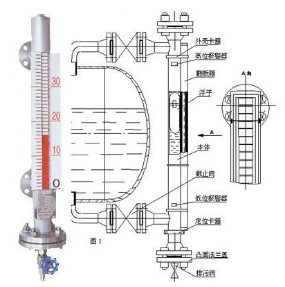 首先,讓我們來了解一下磁翻板液位計(jì)的結(jié)構(gòu):每一臺(tái)磁翻板液位計(jì)都有一個(gè)容納浮球的腔體,稱為主體管或外殼,它通過法蘭或其他接口與容器組成一個(gè)連通器;這樣它腔體內(nèi)的液面與容器內(nèi)的液面是相同高度的,所以腔體內(nèi)的浮球會(huì)隨著容器內(nèi)液面的升降而升降;在腔體的外面裝了一個(gè)翻柱顯示器,因?yàn)槲覀冊(cè)谥圃旄∏驎r(shí)在浮球沉入液體與浮出部分的交界處安裝了磁鋼,它與浮球隨液面升降時(shí),它的磁性透過外殼傳遞給翻柱顯示器,推動(dòng)磁翻柱翻轉(zhuǎn)180°;由于磁翻柱是有紅、白兩個(gè)半圓柱合成的圓柱體,所以翻轉(zhuǎn)180°后朝向翻柱顯示器外的會(huì)改變顏色,兩色交界處即是液面的高度。