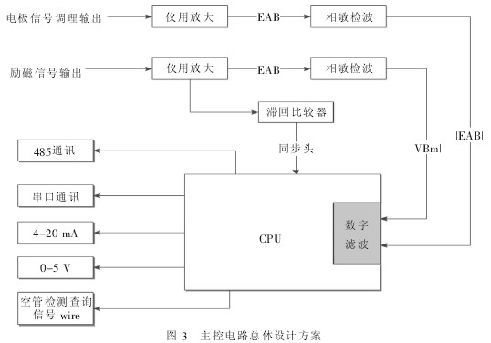 0引言 挖泥船電磁流量計(jì)用來(lái)指導(dǎo)挖泥船操作施工,防止堵管、悶耙,與密度測(cè)量設(shè)備一起使用構(gòu)成產(chǎn)量計(jì),為施工操作與管理提供決策數(shù)據(jù),有利于提高施工效率。其測(cè)量介質(zhì)為液固兩相流體,有別于通常意義下的單一介質(zhì),測(cè)量難度大大增加。而電磁流量計(jì)(EMF)是根據(jù)電磁感應(yīng)定律制成的一種測(cè)量導(dǎo)電性流體流量的儀表[1]。與現(xiàn)有各種流量?jī)x表相比,其直線(xiàn)性好、測(cè)量精度高、測(cè)量范圍和適用范圍廣、耐腐蝕性能強(qiáng),可以解決其他流量計(jì)不易解決的問(wèn)題,如臟污流、腐蝕流等的測(cè)量[2]。 目前國(guó)內(nèi)應(yīng)用于挖泥船的電磁流量計(jì)大多存在零點(diǎn)漂移、轉(zhuǎn)換精度不高、流速不穩(wěn)、空管檢測(cè)易失常等諸多問(wèn)題。對(duì)此,我們進(jìn)行了相關(guān)研究并提出相應(yīng)改進(jìn)措施,現(xiàn)已研發(fā)出一種專(zhuān)門(mén)用于挖泥船的電磁流量計(jì),在耙吸式挖泥船上成功應(yīng)用,取得了很好的效果。本文通過(guò)信號(hào)處理和空管檢測(cè)功能詳細(xì)介紹該新型挖泥船電磁流量計(jì)。 1電磁流量計(jì)工作原理 電磁流量計(jì)分為傳感器和轉(zhuǎn)換器兩部分。傳感器是把流過(guò)管道內(nèi)的導(dǎo)電流體的流速信號(hào)轉(zhuǎn)換為電信號(hào),轉(zhuǎn)換器是把傳感器輸出的電信號(hào)進(jìn)行有用信號(hào)識(shí)別提取并進(jìn)行相關(guān)處理,用于主機(jī)顯示,主要由勵(lì)磁電路、信號(hào)調(diào)理電路、微處理電路等部分組成。圖1為傳感器工作原理示意圖。 根據(jù)法拉第電磁感應(yīng)定律,當(dāng)一導(dǎo)體在磁場(chǎng)中運(yùn)動(dòng)而切割磁力線(xiàn)時(shí),在導(dǎo)體兩端便會(huì)產(chǎn)生感應(yīng)電動(dòng)勢(shì)。設(shè)在均勻磁場(chǎng)中,垂直于磁場(chǎng)方向有一個(gè)直徑為D的管道。管道由不導(dǎo)磁材料制成,內(nèi)表面加絕緣襯里。當(dāng)導(dǎo)電的液體在管道中流動(dòng)時(shí),導(dǎo)電液體就切割磁力線(xiàn),因而在磁場(chǎng)及流動(dòng)方向垂直的方向?qū)a(chǎn)生感應(yīng)電動(dòng)勢(shì)。如果在管道截面垂直于磁場(chǎng)的直徑兩端安裝一對(duì)電極,只要管道內(nèi)流速υ為軸對(duì)稱(chēng)分布,兩極之間就會(huì)產(chǎn)生感應(yīng)電動(dòng)勢(shì)[3],此感應(yīng)電動(dòng)勢(shì)與流速具有線(xiàn)性關(guān)系。其表達(dá)式為: E=K·B·D·V(1) 式中:V為測(cè)量管道內(nèi)截面上的平均流速(m/s); K為儀表常數(shù); D為測(cè)量管內(nèi)直徑(m); B為磁感應(yīng)強(qiáng)度(T)。 轉(zhuǎn)換器將此感應(yīng)電動(dòng)勢(shì)測(cè)出,再根據(jù)線(xiàn)性關(guān)系式即可得出流速信號(hào)。圖2為電磁流量計(jì)整體設(shè)計(jì)示意圖。 考慮到傳感器出來(lái)的微弱信號(hào)容易在傳輸線(xiàn)上損耗,故而電極信號(hào)調(diào)理板和空管檢測(cè)功能板就近放置于傳感器出線(xiàn)口,調(diào)理后經(jīng)屏蔽線(xiàn)傳輸至轉(zhuǎn)換器上的主控電路。 結(jié)構(gòu)上管道本身就是個(gè)大的屏蔽體,防止勵(lì)磁線(xiàn)圈磁場(chǎng)泄露,信號(hào)采用屏蔽線(xiàn)傳輸,減少線(xiàn)與線(xiàn)之間信號(hào)干擾,以及空間傳播的干擾,保證信號(hào)的完整性。 電路上采用雙核主從式控制,方便流速測(cè)量及其空管檢測(cè),克服了以往電磁流量計(jì)需要配合密度計(jì)來(lái)使用的缺陷;同時(shí)利用微機(jī)技術(shù),使其各方面性能大大提高,更加智能化,更加便于管理施工。 2勵(lì)磁方式的合理選擇 目前國(guó)產(chǎn)挖泥船流量計(jì)大多采用低頻方波勵(lì)磁方式,其主要特點(diǎn)是能避免零點(diǎn)漂移及無(wú)正交干擾,抗同相干擾能力較好[4]。但對(duì)于液固兩相流體而言,當(dāng)固體顆粒撞擊電極,表面電位變化形成尖峰狀噪聲,信號(hào)呈現(xiàn)大幅度波動(dòng)。而低頻方波勵(lì)磁不能從硬件技術(shù)上消除這種由于沖擊造成的干擾,要實(shí)現(xiàn)測(cè)量結(jié)果的穩(wěn)定,只能通過(guò)調(diào)整勵(lì)磁頻率外加軟件手段加以消除,但有兩方面的缺陷: (1)挖泥船上工況復(fù)雜,挖泥工況與合適勵(lì)磁頻率匹配問(wèn)題很難完美解決,只能通過(guò)現(xiàn)場(chǎng)不斷調(diào)試較合適的頻率參數(shù)。同一工地不同土質(zhì)都需要改變頻率參數(shù),以目前的現(xiàn)場(chǎng)條件及技術(shù)水平,要做到這一步非常困難,目前基本上采用大體上可測(cè)量的單一頻率。 (2)采用軟件濾波降低由沖擊噪聲產(chǎn)生的波動(dòng)幅度,波動(dòng)幅度平滑程度越高,則測(cè)量結(jié)果的真實(shí)性和實(shí)時(shí)性就越差,很多情況下會(huì)導(dǎo)致測(cè)量結(jié)果失真,尤其當(dāng)高流速、固體含量高、大顆粒的工況。 而采用工頻(50Hz)電源交流勵(lì)磁方式,消除了電極表面的極化于擾,抗固體顆粒撞擊電極形成尖峰狀噪聲能力強(qiáng)。由于磁場(chǎng)是交變的,所以輸出信號(hào)也是交變信號(hào),放大和轉(zhuǎn)換低電平的交流信號(hào)要比直流信號(hào)容易得多。但值得注意的是,用交流勵(lì)場(chǎng)會(huì)帶來(lái)一系列的電磁干擾問(wèn)題。例如正交干擾、同相干擾等,這些干擾信號(hào)與