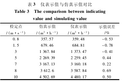 從表 3 數據可以看出,樣機測得的流量與仿真所得流量之間的誤差很小,其中最大的示值誤差也不超過 -0. 78%,充分說明了可以用等效信號作用范圍內的平均流速來代替被測管道截面內的平均流速的可行性,即驗證了等效信號作用范圍的存在和確定方法的正確性。