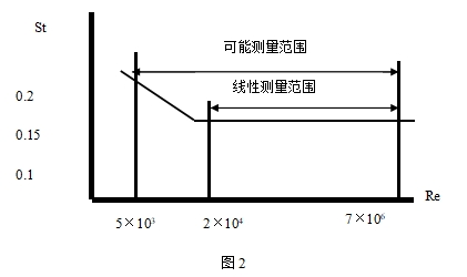 由此可見,通過測量卡門渦街分離頻率便可算出瞬時流量。其中,斯特羅哈爾數(St)是無因次未知數,圖2表示斯特羅哈爾數(St)與雷諾數(Re)的關系。