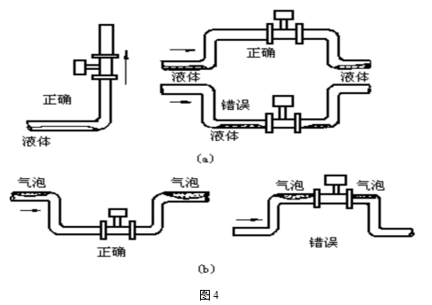d)測量液體時,為了保證管內充滿液體,所以在垂直或傾斜管道安裝儀表時,應該保證液體流動方向從下而上。若管道內含少量氣體,為了防止氣體進入儀表測量管,儀表應安裝在管線的較低處如圖4b所示