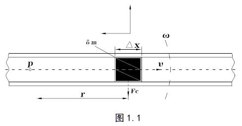 當(dāng)一個(gè)位于以P為固定點(diǎn)(旋轉(zhuǎn)中心)作旋轉(zhuǎn)運(yùn)動(dòng)的管子內(nèi)的質(zhì)點(diǎn)做朝向旋轉(zhuǎn)中心或離向旋轉(zhuǎn)中心的運(yùn)動(dòng)時(shí),將產(chǎn)生一慣性力,原理如圖1.1: 圖中質(zhì)量為δm的質(zhì)點(diǎn)以勻速υ在管道內(nèi)向右運(yùn)動(dòng),而管道圍繞固定點(diǎn)P以角速度ω旋轉(zhuǎn)。此時(shí)這個(gè)質(zhì)點(diǎn)將獲得兩個(gè)加速度分量: