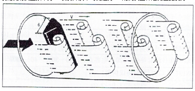 在氣體流體中設置三角柱型旋渦發生體,則從旋渦發生體兩側交替地產生有規則的旋渦,這種旋渦稱為卡門旋渦,如右圖所示,旋渦列在旋渦發生體下游非對稱地排列。