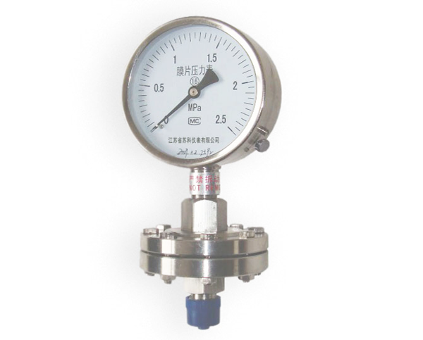 膜片壓力表由測量系統(包括法蘭接頭、波紋膜片)、傳動指示機構(包括連桿、齒輪傳動機構、指針和度盤)和外殼(包括表殼和罩圈)等組成。膜片壓力表外殼為防濺結構,具有較好的密性,故能保護其內部機構免受污穢浸入。